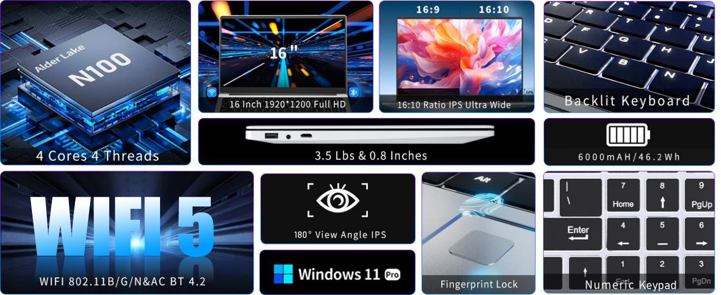 - 【HIGH PERFORMANCE LAPTOP】Intel 12th Gen Celeron N100 Processor ( 4 cores, 4 threads, L3 Cache: 6 MB, Clockspeed at 1.8 GHz, Up to 3.4 GHz at Max Turbo Frequency). No latency playing simple games, basic video editing and efficient multitasking with windows 11 pro system included. Powerful and faster than normal processors. ( Performance is much higher than Celeron N97/N95/N5095/Pentium N5030 )