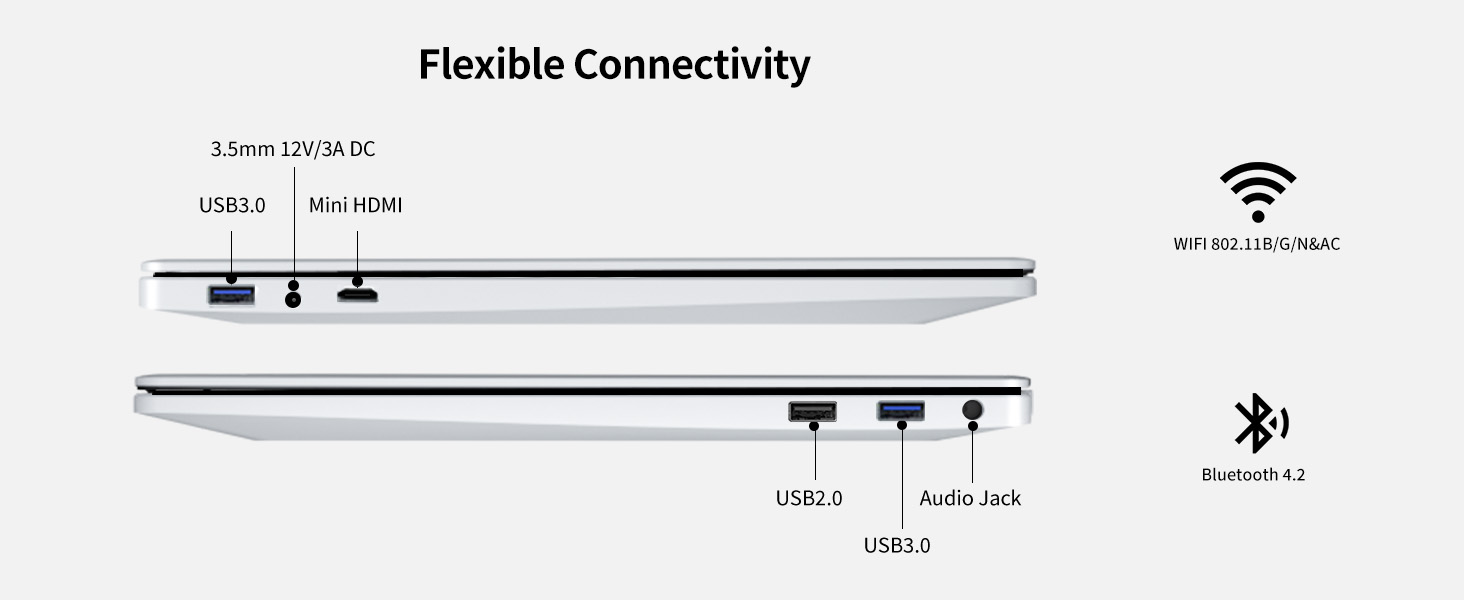 - 【VERSATILE CONNECTIVITY】USB 3.0 *2, USB 2.0 *1, DC *1, mini HDMI *1, headphone jack*1, 2.5 inchs SATA Interface*1. About wireless connections, BT 4.2 and sensitive wifi 2.4/5GHz ensure smooth experiences.
